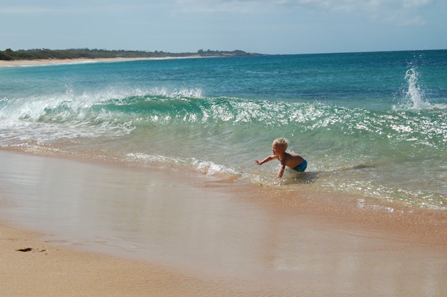 Zara and JC pretending to be dolphins! This beach is 3 miles long... the longest white sand beach in Hawaii.